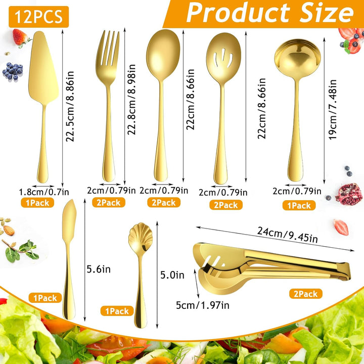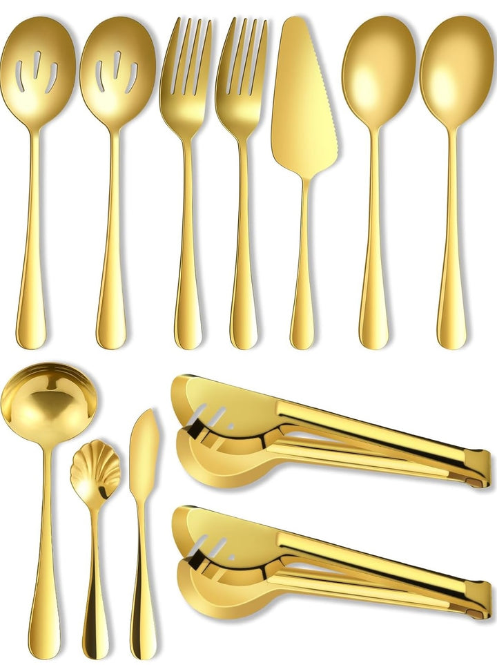 - Overall size: This set includes 12 pieces gold serving utensils, including 2 x slotted spoons, 2 x serving spoons, 2 x forks, 2 x serving tongs,1 x butter knife, 1 x soup ladle, 1 x sugar spoon and 1 x pie server.