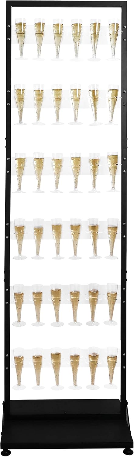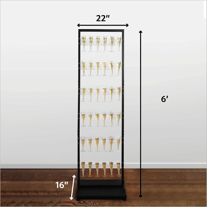 - Overall size: This drink wall measures approximately 6 feet tall and is 22 inches wide & 16 inches long, our free standing display wall can hold up to 36 cups, it has 6 tier shelfs with each shelf holding 6 flute cups comfortably, each cup holder can be removed if you would like to space out your drinks or use bigger cups.