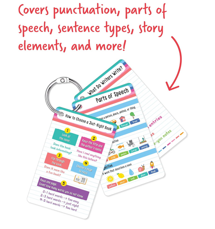- What’s Included: The set comes equipped with 16 vibrant, pre-punched writing and reading flash cards as well as a book ring to take your flash cards on-the-go.